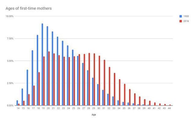 Demographic data consistently show a rightward shift in age at first birth — from the early-20s to the late-20s or early-30s — accompanied by a steep post-peak drop-off and limited late recovery.