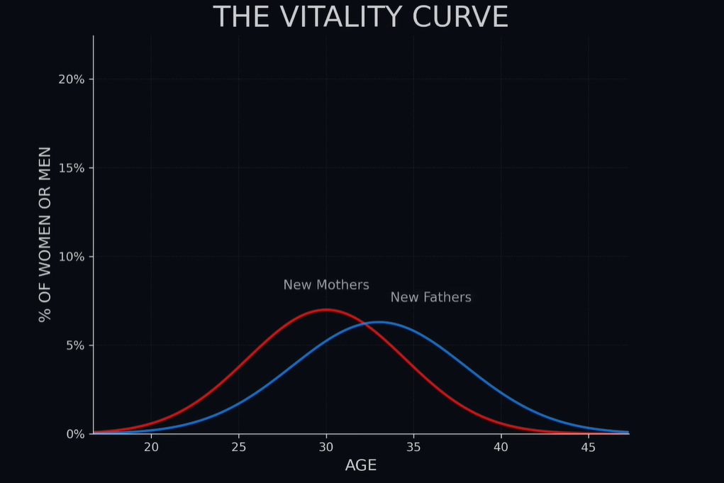 Fertility declines non-linearly. Partner availability declines with age. Life trajectories diverge rather than reconverge. Assisted reproductive technologies extend the tail but do not change the underlying distribution.
