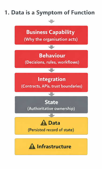 - Data Is a Symptom of Function — why starting at the data layer mistakes persistence for capability.