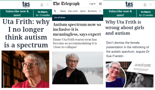 https://www.tes.com/magazine/analysis/general/why-uta-frith-wrong-about-girls-and-autism - Frith, U. (2026). Interview with Tes magazine, as reported in The Telegraph: Autism spectrum now so inclusive it is meaningless, says expert.